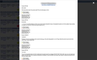 UNR Professor Ratings is a free Chrome add-on that enhances the MyNevada course registration experience by pulling professor profile ratings from Rate My Professors. When searching for classes on MyNevada, this add-on displays ratings from Rate My Professors right next to each professor's name, allowing students to make more informed decisions. By clicking on the professor's name, users can view comments and access the professor's Rate My Professors profile page.